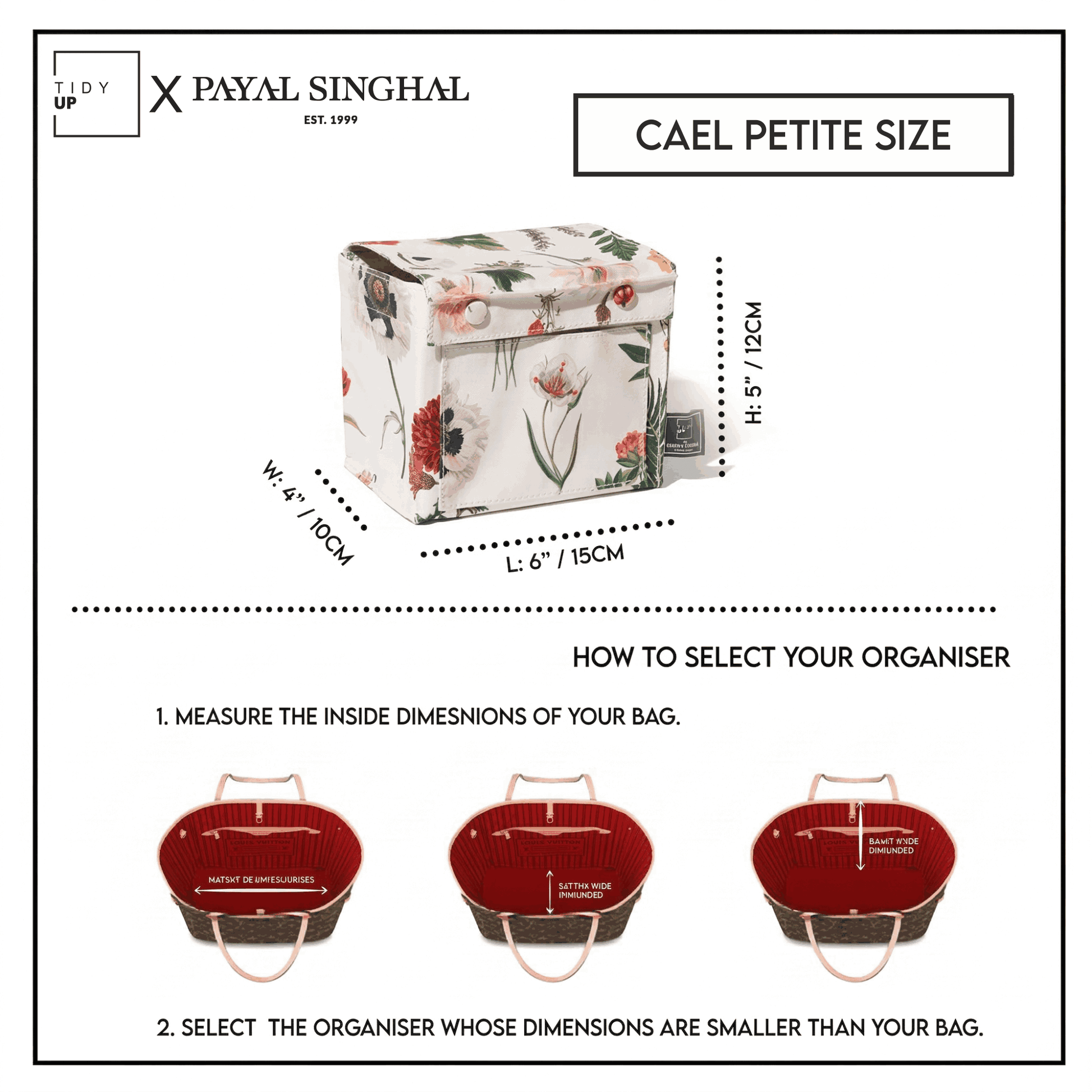 Compact Petite Organiser transforms your handbag into a perfectly ordered space. This structured insert fits Square handbag, featuring dedicated compartments for cards, coins, keys, and daily essentials—keeping everything visible and within reach. The rigid design maintains your bag's shape while preventing items from shifting. Finished in the exclusive Payal Singhal print, it combines luxury aesthetics with practical organisation. An investment in daily convenience and refined style.